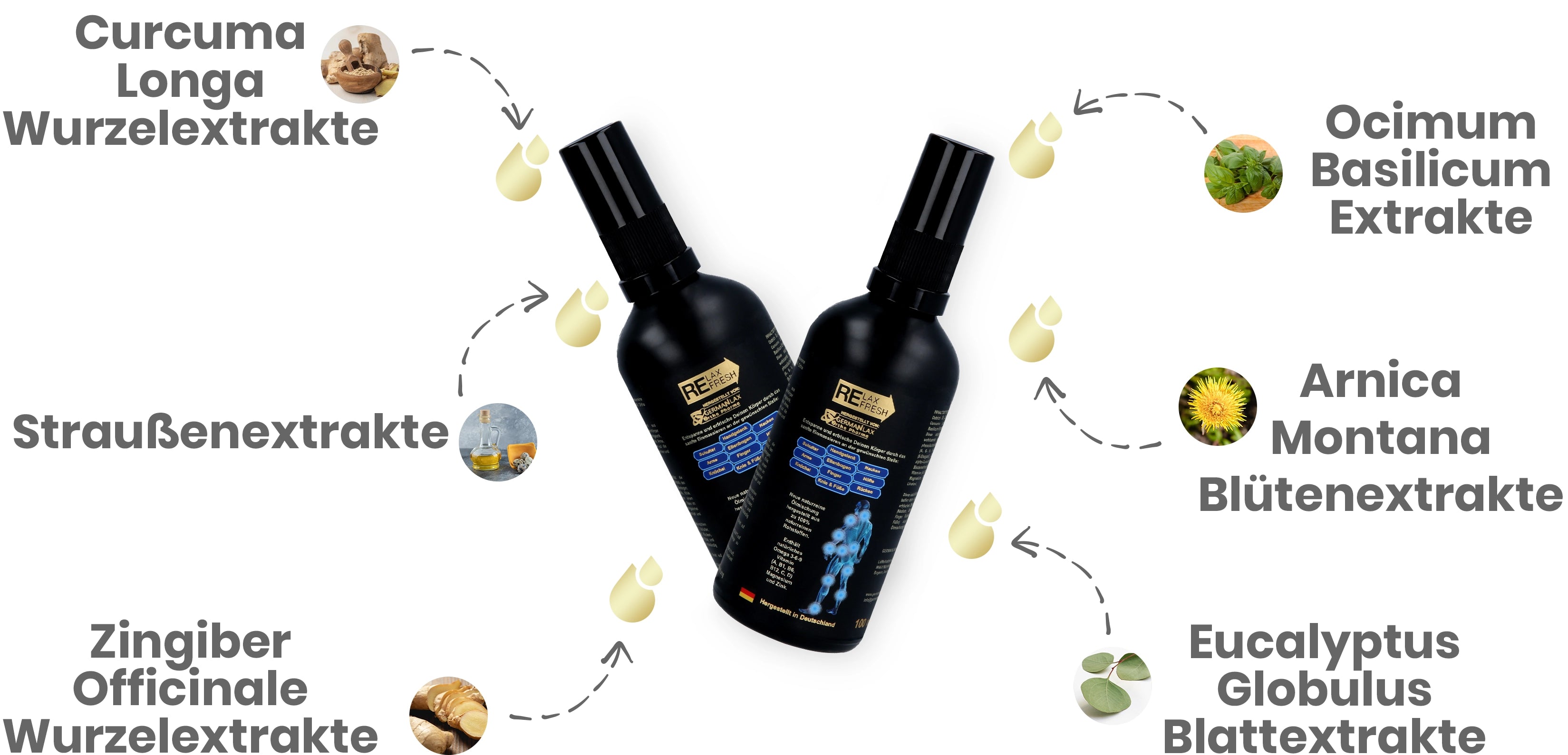 Relax & Refresh für Muskeln und Gelenke wird aus reinen und wirksamen natürlichen Inhaltsstoffen wie Straußenölextrakten, Arnikaextrakten, Kurkumaextrakten und Ingwerwurzelextrakten hergestellt. Es wird mit der neuesten deutschen Technologie hergestellt, die eine sichere und nebenwirkungsfreie Erfahrung gewährleistet, die für jeden geeignet ist - auch für schwangere und stillende Frauen.